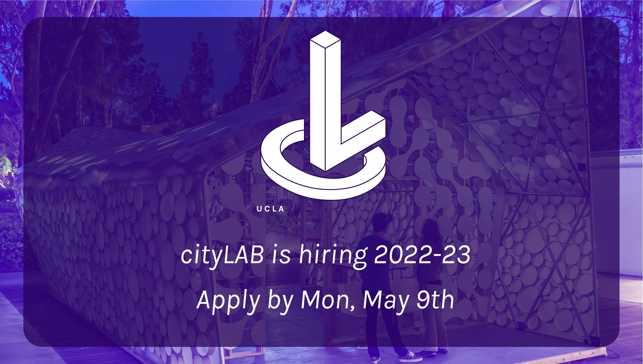 cityLAB, an urban design research center housed within UCLA AUD, is seeking new collaborators for Summer 2022 and the 2022-23 Academic Year. This application is for continuing and incoming UCLA AUD students only. Applications end Monday, May 9th. Click the link to apply.